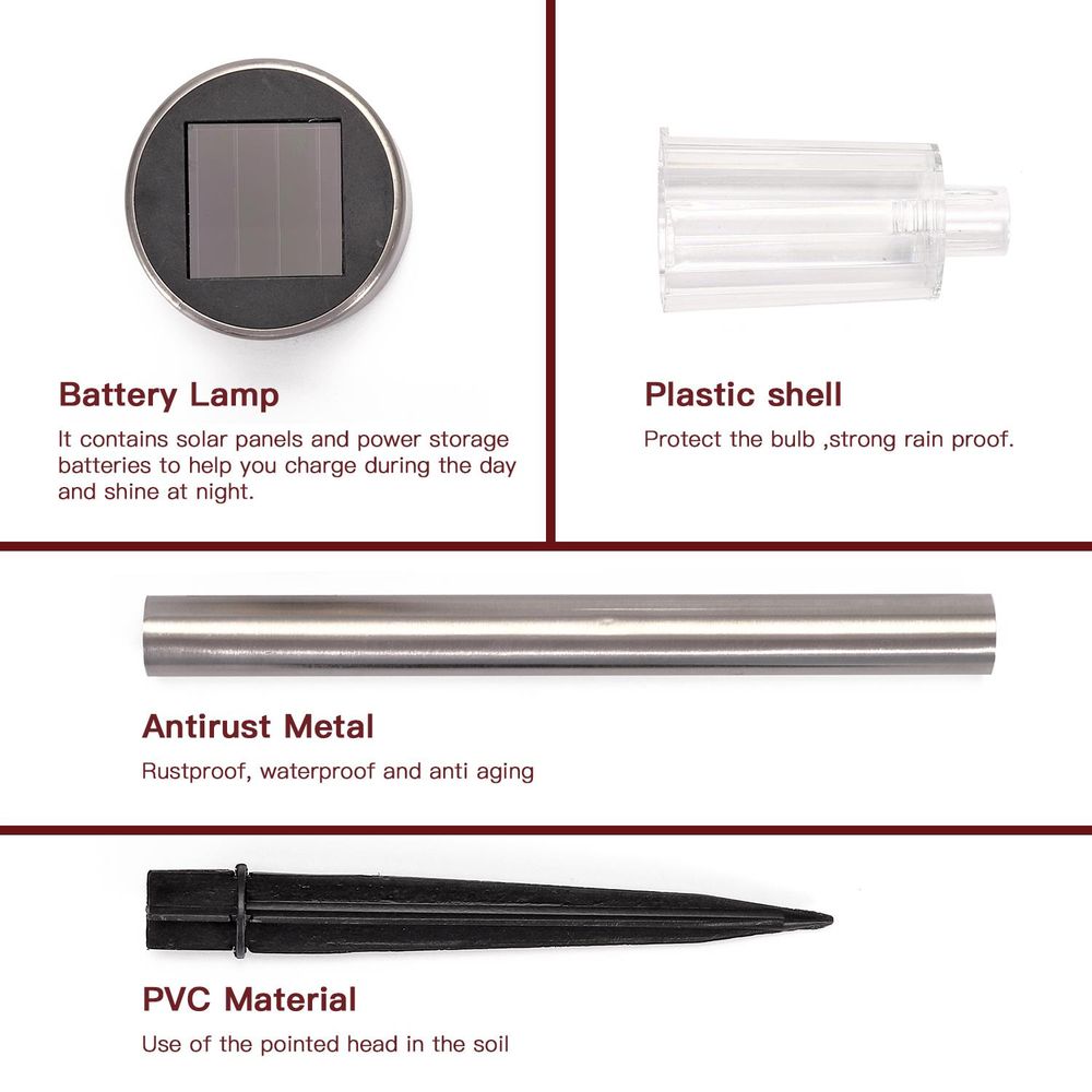DIMENSIONS: Made of stainless steel & durable plastic; Water resistant IPX4; CE certified, RoHS compliant; H: 35cm (of which 11.5cm in the ground ) x W: 5.5cm x D: 5.5cm