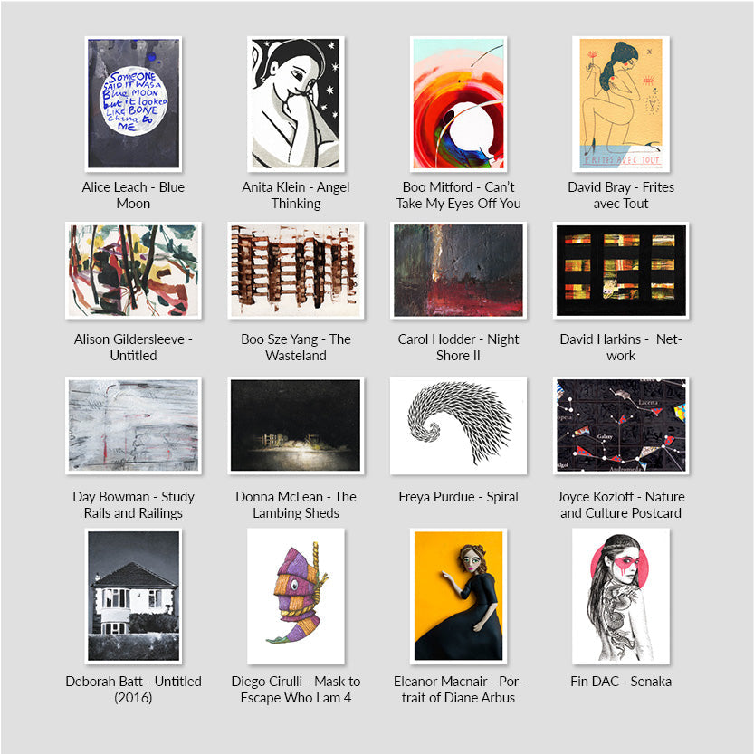 Alice Leach - Blue Moon, Alison Gildersleeve - Untitled, Anita Klein - Angel Thinking, Boo Sze Yang - The Wasteland, Boo Mitford - Can't Take My Eyes Off You, Carol Hodder - Night Shore II, David Bray - Frites avec Tout, David Harkins - Network, Day Bowman - Study Rails and Railings, Deborah Batt - Untitled (2016), Diego Cirulli - Mask to Escape Who I am 4, Donna McLean - The Lambing Sheds, Eleanor Macnair - Portrait of Diane Arbus, Freya Purdue - Spiral, Fin DAC - Senaka, Joyce Kozloff - Nature and Culture Postcard, John MacLean - Untitled, John Wragg RA - Untitled, Lois Wallace - Separation, Mandy Payne - Fragment of a Vertical City, Mark Peppé - Victoria, Martyn Brewster - Heartsong Series, Melissa Scott Miller - Self Painting with Joey, Mick Rooney RA - The Night Vigil, Natsko Seki - Craft Museum - Pink, Patrick Hughes - Art in Life, Pippa Gatty - Untitled, Oliver Marsden - ISO 1BS, Rosie Emerson - Emily, Simon Carter - Essex Creek II, Simon Matthewson - White Blue Orange, Susie Hamilton - Berck - Plage |