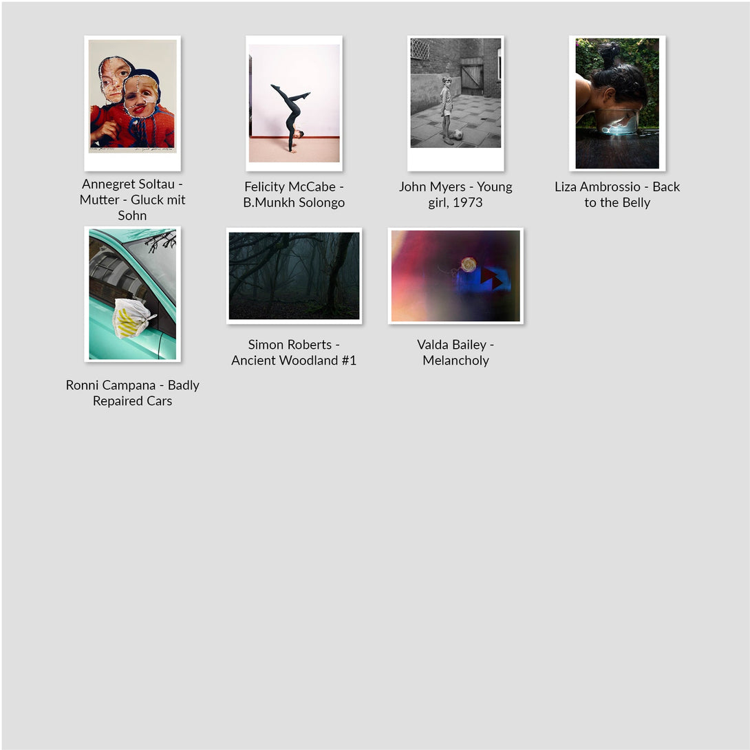Alice Hawkins - Priscilla Binion's Casino Las Vegas 2010, Allan Forsyth - AQUA FLORA X, Amelia Troubridge - Jodie on the Horse, Ashkan Sahihi - Untitled, Catherine Losing - Balaclava, David Hoffman - Squatted tenement Whitechapel 1979, Edouard Taufenbach - La Petite Baigneuse, Ellie Davies - Fires 10 2018, Gerry Johansson - Aberdeen South Dakota 2017, Lisa Levine - Swim, Mirjana Vrbaski - Untitled, Paul Cupido - Teardrop 2018, Richard Ansett - BIRTH - Portrait of Artist Grayson Perry, Samuel Hicks - Impala, The Family Acid - Rose in the Marrakech pillow souk, Annegret Soltau - Mutter - Gluck mit Sohn, Felicity McCabe - B.Munkh Solongo, John Myers - Young girl 1973, Liza Ambrossio - Back to the Belly, Ronni Campana - Badly Repaired Cars, Simon Roberts - Ancient Woodland 1, Valda Bailey - Melancholy |