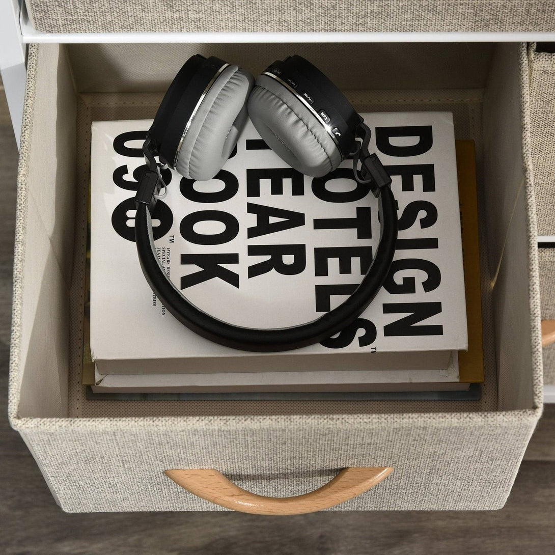 • Linen-feel drawers can be removed and folded. Comes with handle to open and close