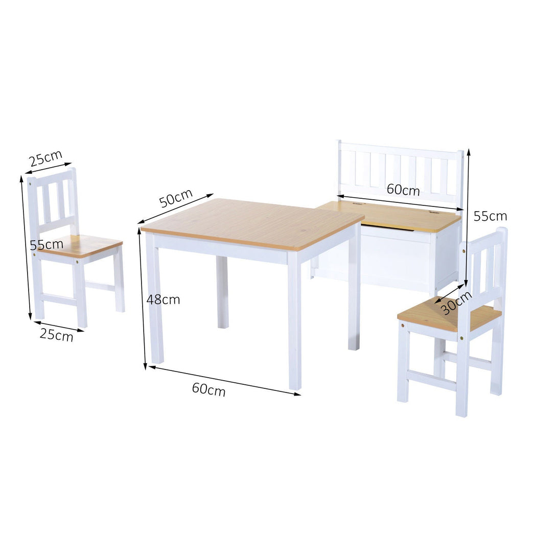 • Includes 4-piece kids side set, a table, 2 chairs and a storage bench