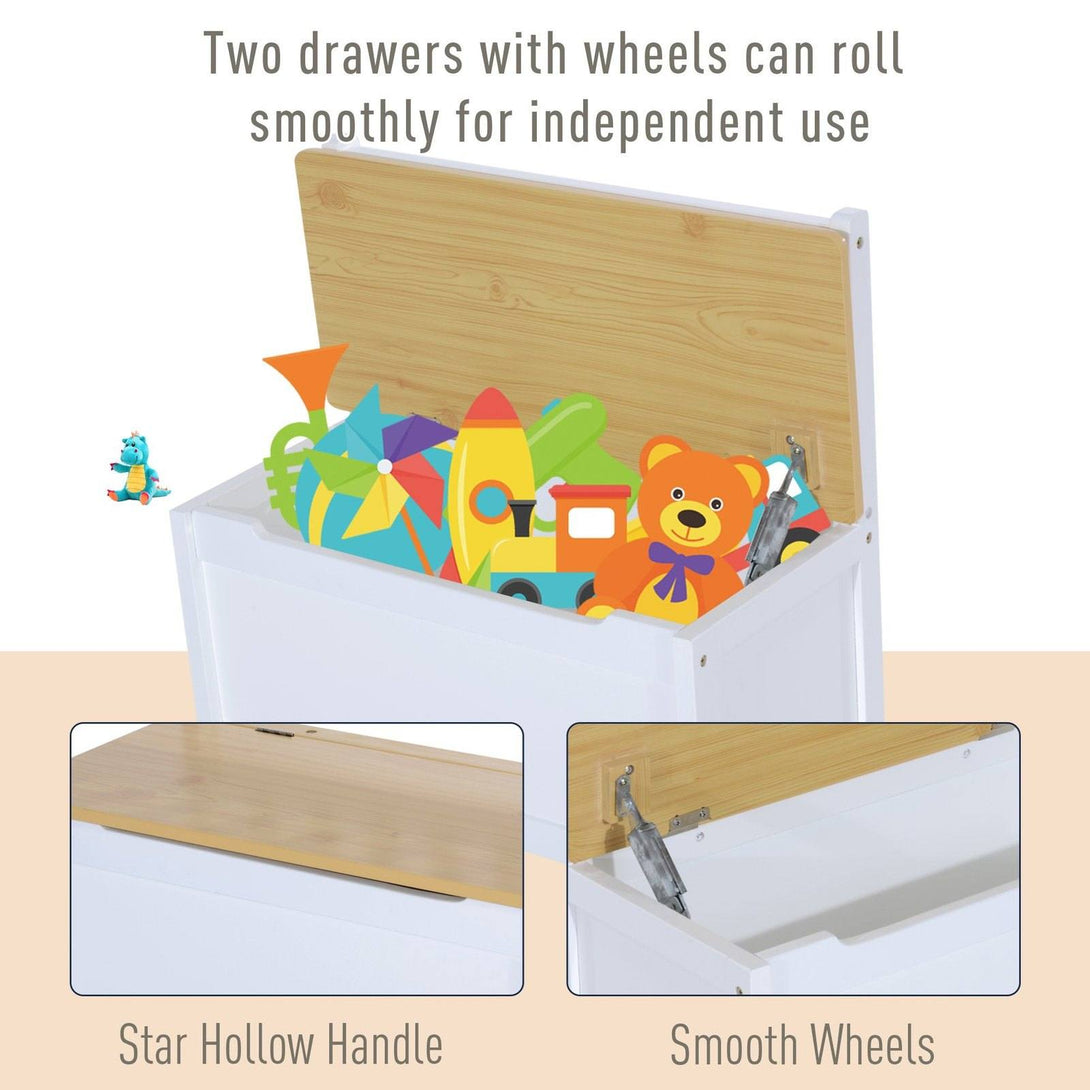 This HOMCOM Kids table and chair set will be a great addition to a kids bedroom. Comes complete with 2 chairs, a table, and a storage bench, it is designed in a great colour combination of white with natural wood table top and seating. Made from Pine wood and MDF for strength, and has a classic design. The storage bench can be very useful as it can store items under the lift up seat. This will be a great addition to any kids room décor.