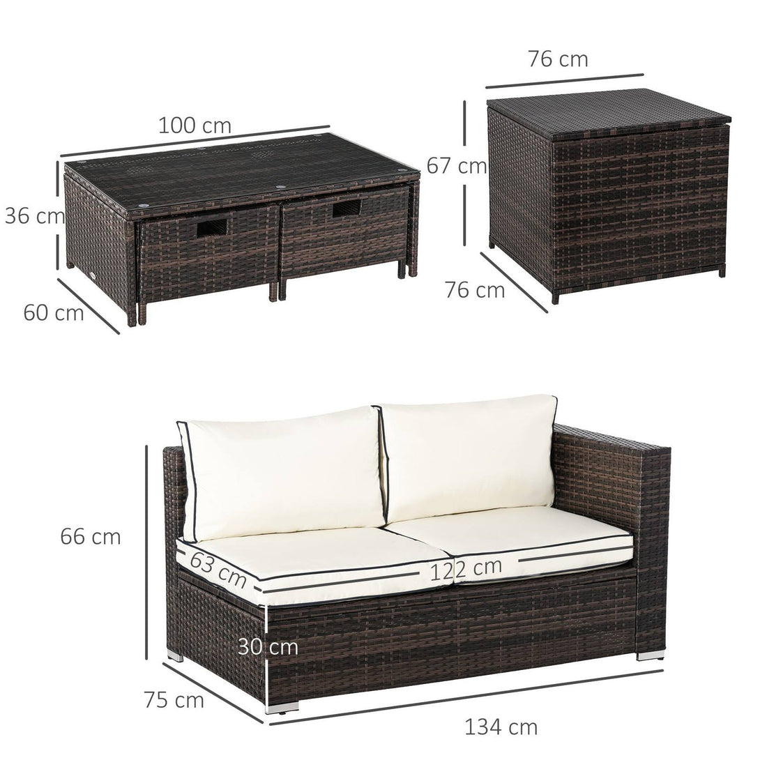 • 4 piece outdoor dining set includes 2 two-seater sofas, a storage table and a coffee table with 2 drawers