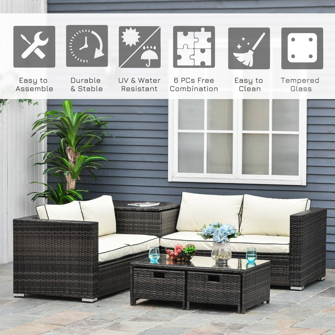 Generous in size and stylish in design, let this outdoor corner sofa from Outsunny take the lead for your outdoor leisure times this season. The small garden furniture consists of four pieces – two two-seater sofas, a tall storage corner table and an oblong coffee table with drawers, giving you plenty of room to relax all day by yourself or with others. Discreet storage is located both on the tall corner table of the garden furniture sets, with two drawers in the oblong coffee table.