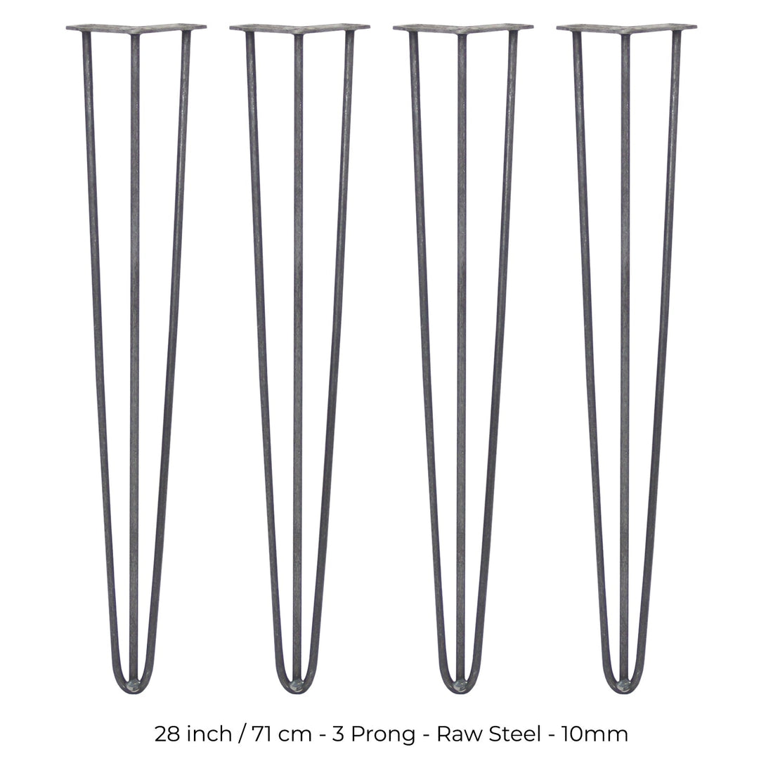 4 x 28" Hairpin Legs - 3 Prong - 10mm - Raw Steel