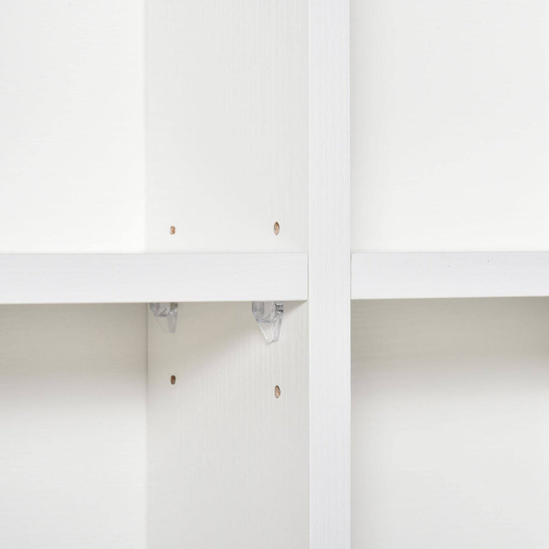- Constructed in 4 vertical units, the upper and down four shelves are adjustable in three levels
