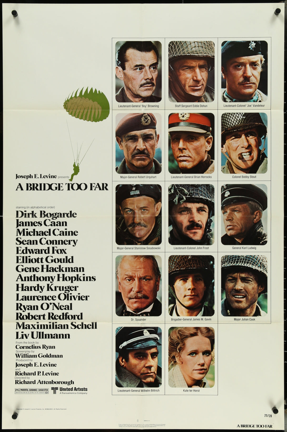 A 27" x 41" (69 x 104 cm) original folded one-sheet movie poster for A Bridge Too Far, the 1977 epic film directed by Richard Attenborough and starring Dirk Bogarde, James Caan, Michael Caine, Sean Connery and Gene Hackman. It has edge and fold wear and some markings.