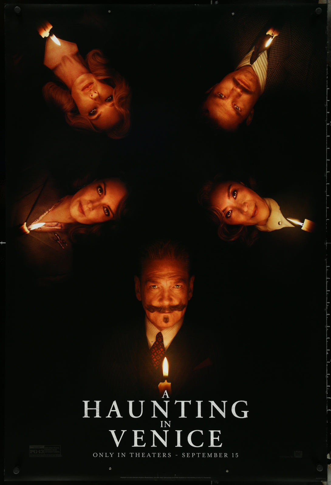 An unfolded double-sided teaser one sheet movie poster for A Haunting In Venice (2023; based on Agatha Christie's novel), featuring Kenneth Branagh, Kelly Reilly, and Michelle Yeoh. Product measures 27" x 40" (69 x 102 cm) and has minor edge wear and creasing.