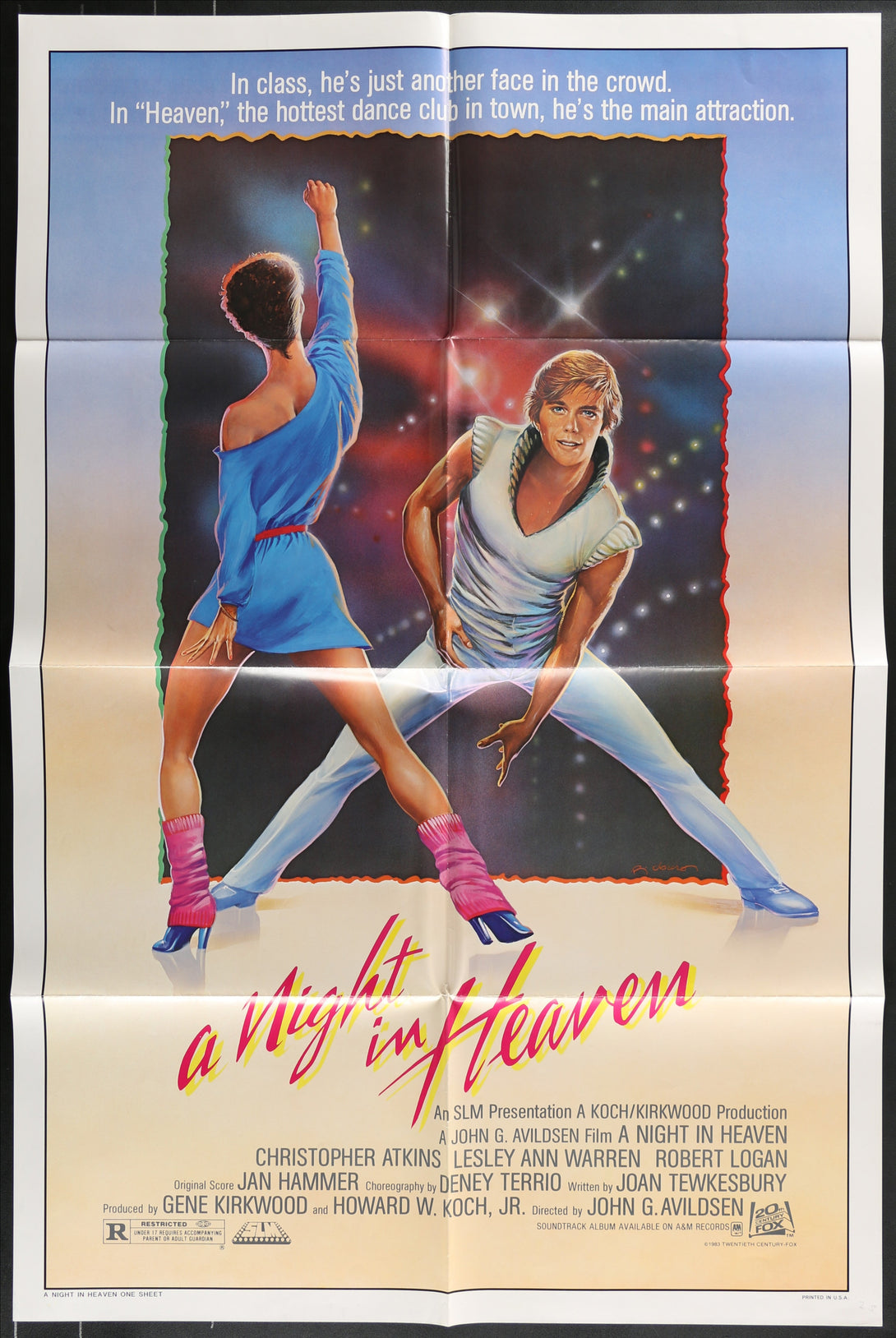 This A Night in Heaven (1983) movie poster is an original folded one-sheet, measuring 27" x 41" (69 x 104 cm). It features a dance drama directed by John G. Avildsen and starring Christopher Atkins, Lesley Ann Warren, and Robert Logan. Some edge and fold wear present with markings along the bottom horizontal fold and a number written in the border bottom right corner in pencil.
