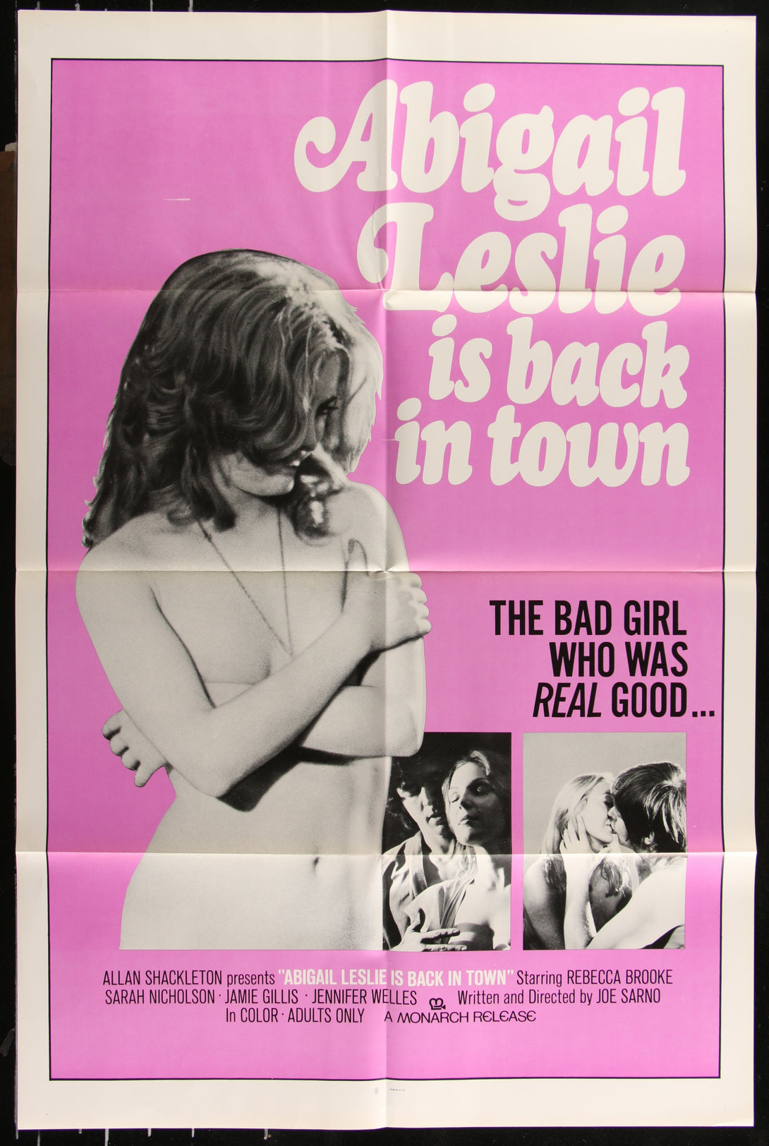 An authentic folded one-sheet movie poster, measuring 27" x 41" (69 x 104 cm), for the 1975 film Abigail Leslie Is Back In Town. This adult movie, directed by Joe Sarno, features Rebecca Brooke and Sarah Nicolson. Scuff top left, with some wear to the edges and folds.