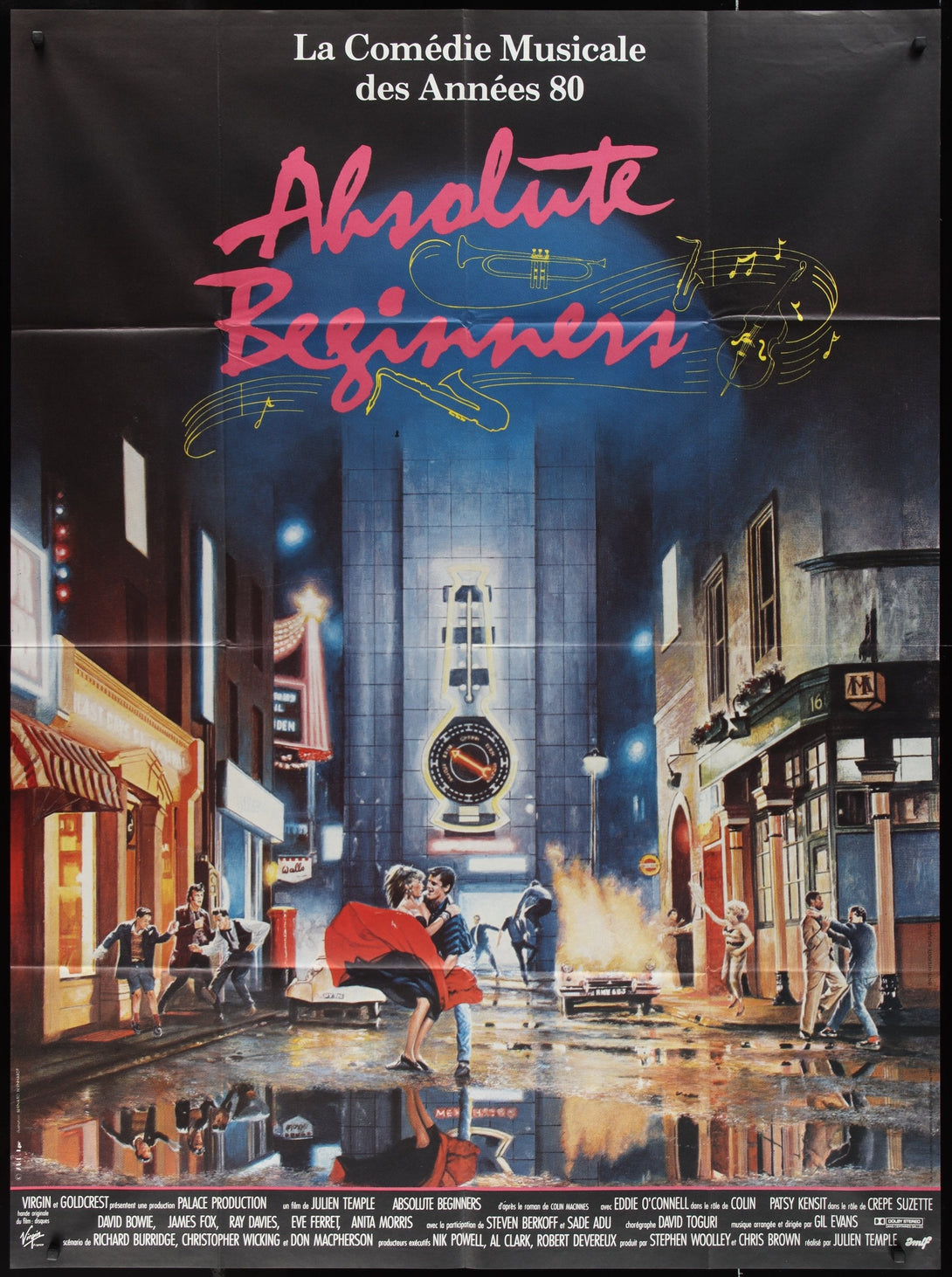 An authentic French Grande Movie Poster from 1986 for Absolute Beginners, directed by Julien Temple and featuring Eddie O'Connell, Patsy Kensit, and David Bowie, measuring 120 x 160cm. Shows signs of edge and fold wear.