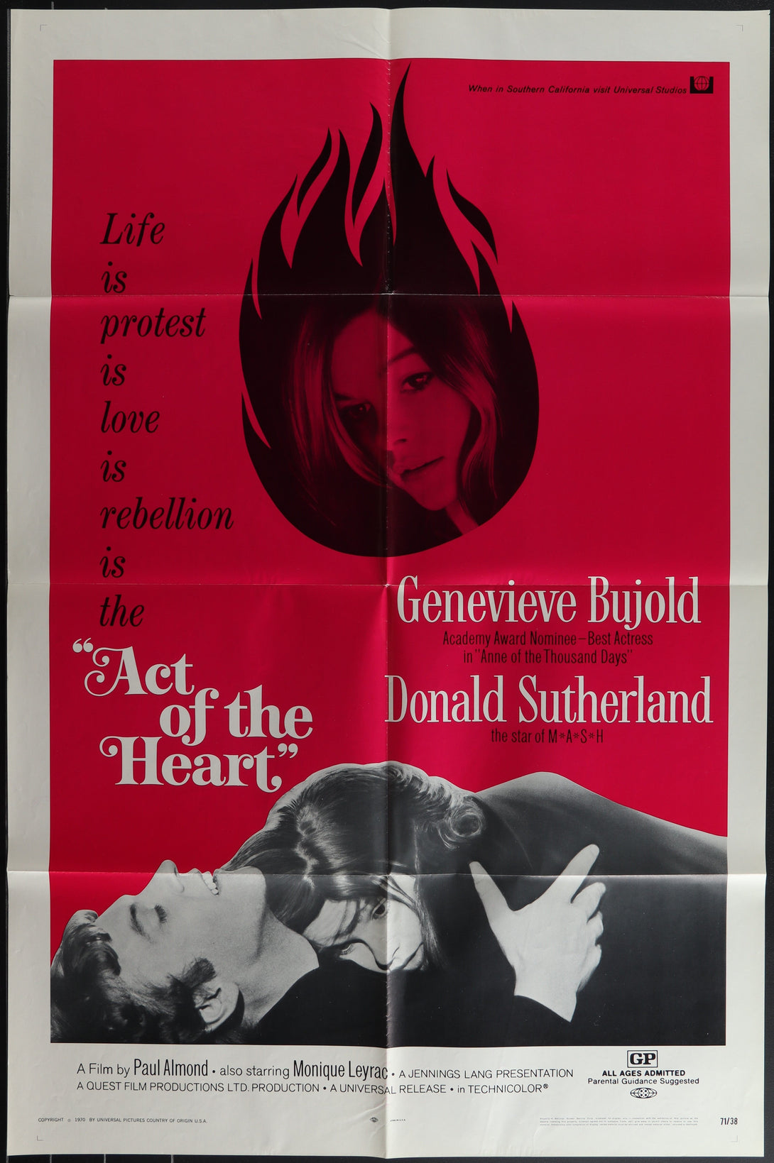 A Folded US One Sheet Movie Poster for the 1971 Paul Almond Canadian romantic drama Act of the Heart, starring Genevieve Bujold and Donald Sutherland. Measuring 27" x 41" (69 x 104 cm), it displays edge and fold wear with minor separation at fold meet points and edges.