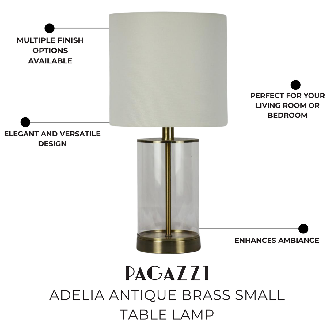 The Adelia Antique Brass Small Table Lamp is a beautifully simple table light with a clear glass base, paired with an ivory shade and a brushed gold effect finish. Perfect for creating ambience in a bedroom or living room.