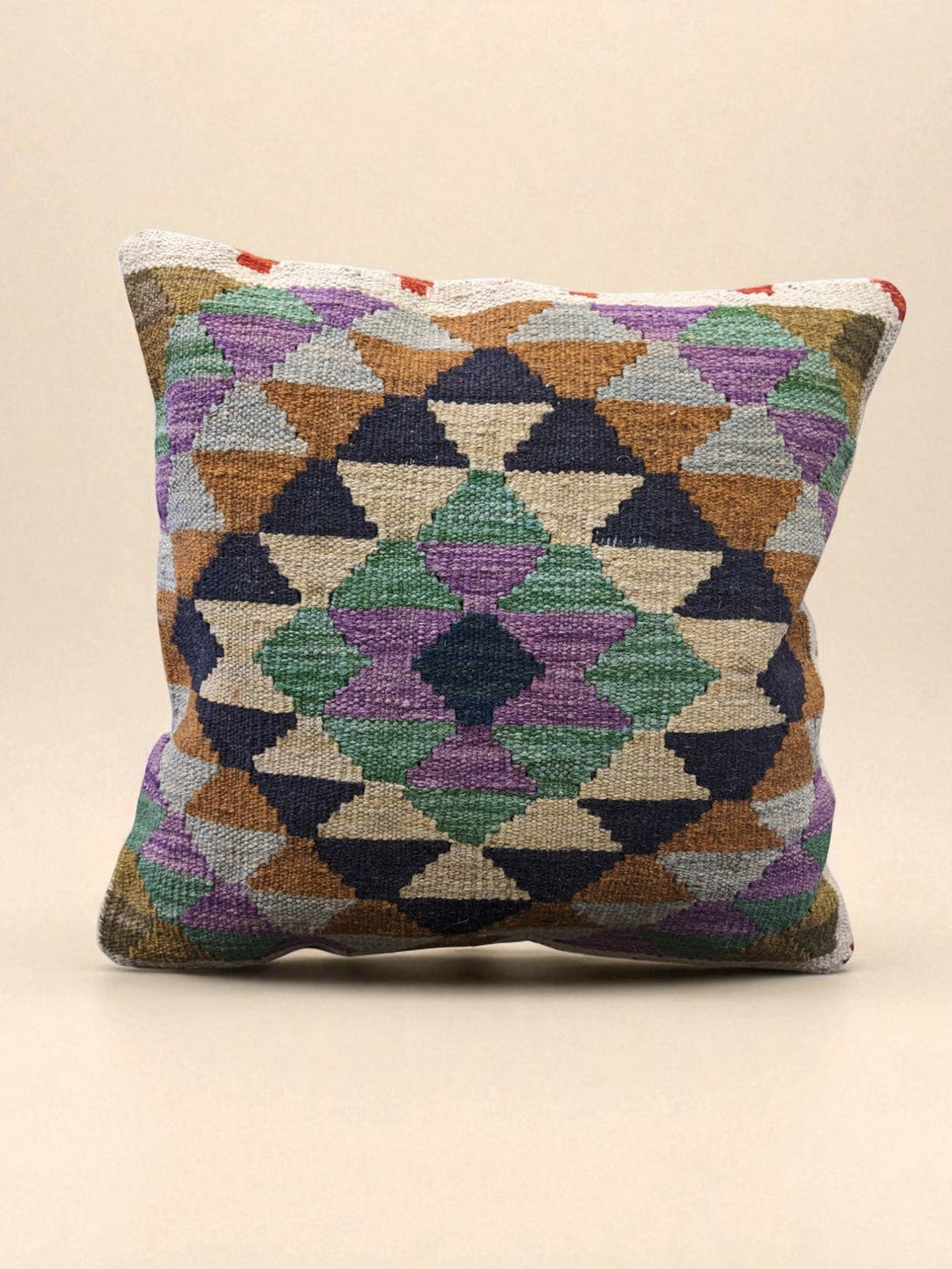 Each Afghanistan Kilim Cushion Cover is a one of a kind creation made from vintage tribal kilims. Bold geometric patterns and earthy tones bring a touch of tradition and timeless charm to any setting. Crafted from pure wool with a sturdy cotton backing, they blend rustic texture with rich cultural history. Perfect for adding warmth character and story to your home.