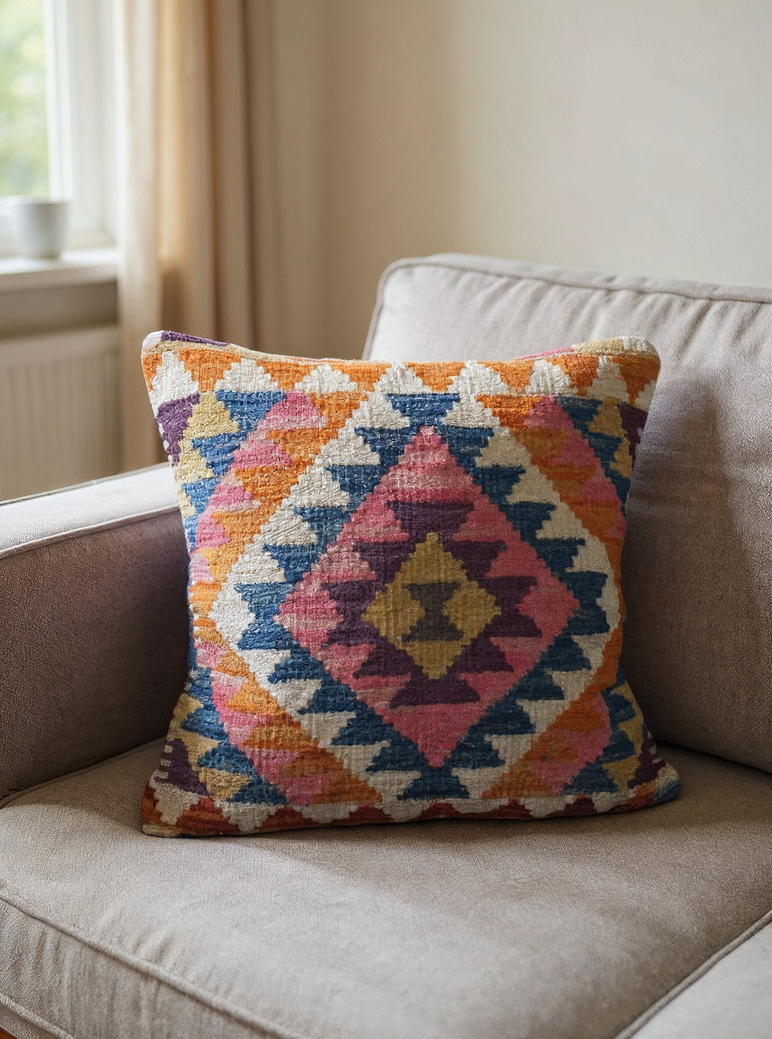 Each Afghanistan Kilim Cushion Cover is a one of a kind creation made from vintage tribal kilims. Bold geometric patterns and earthy tones bring a touch of tradition and timeless charm to any setting. Crafted from pure wool with a sturdy cotton backing, they blend rustic texture with rich cultural history. Perfect for adding warmth character and story to your home.