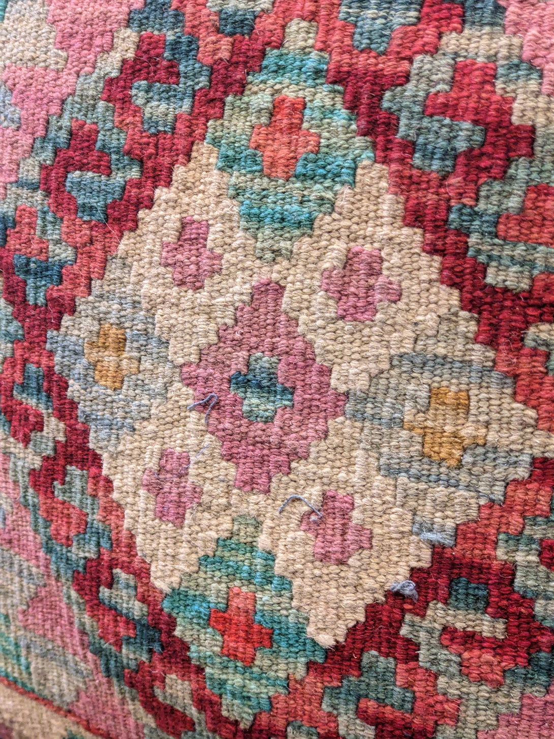Each Afghanistan Kilim Cushion Cover is a one of a kind creation made from vintage tribal kilims. Bold geometric patterns and earthy tones bring a touch of tradition and timeless charm to any setting. Crafted from pure wool with a sturdy cotton backing, they blend rustic texture with rich cultural history. Perfect for adding warmth character and story to your home.