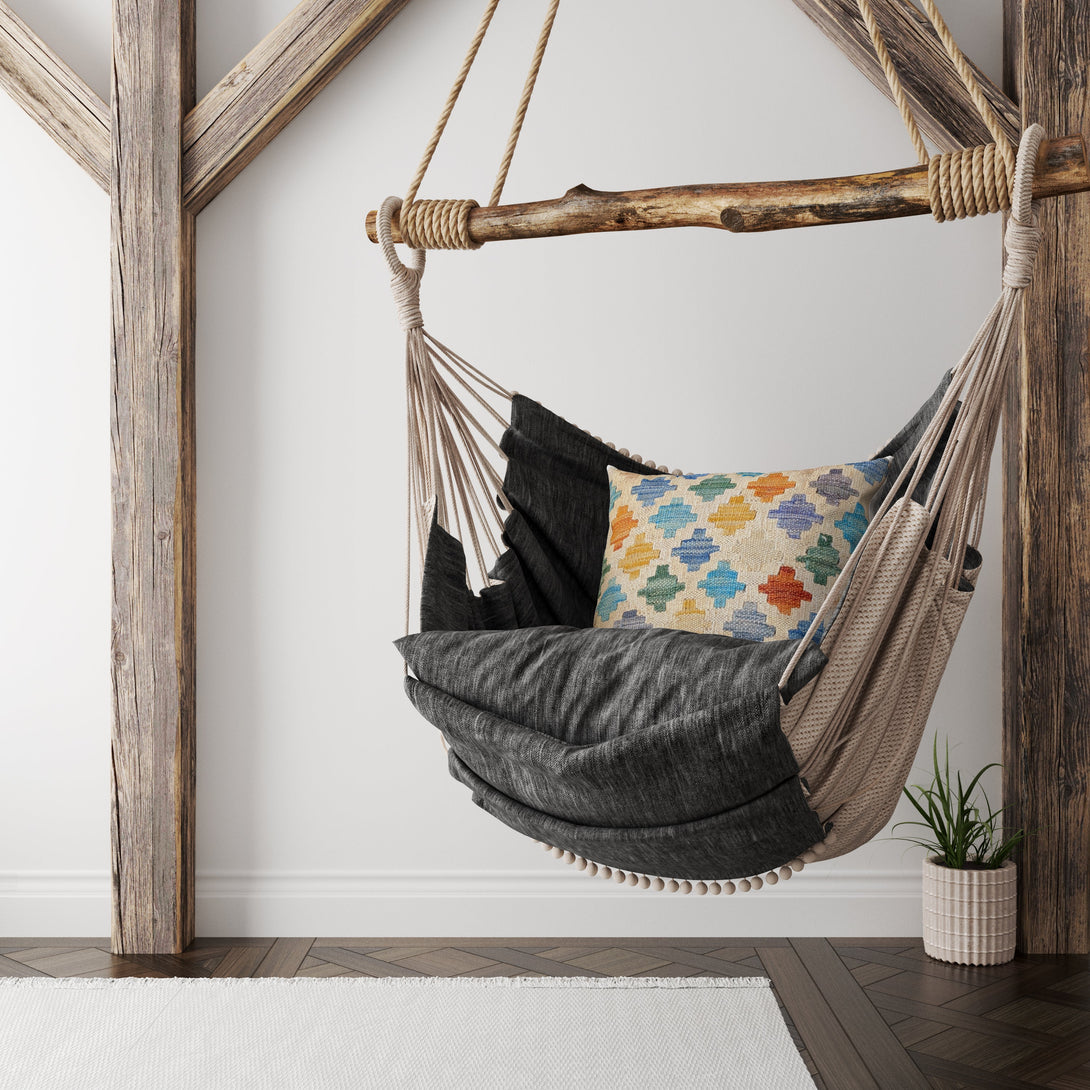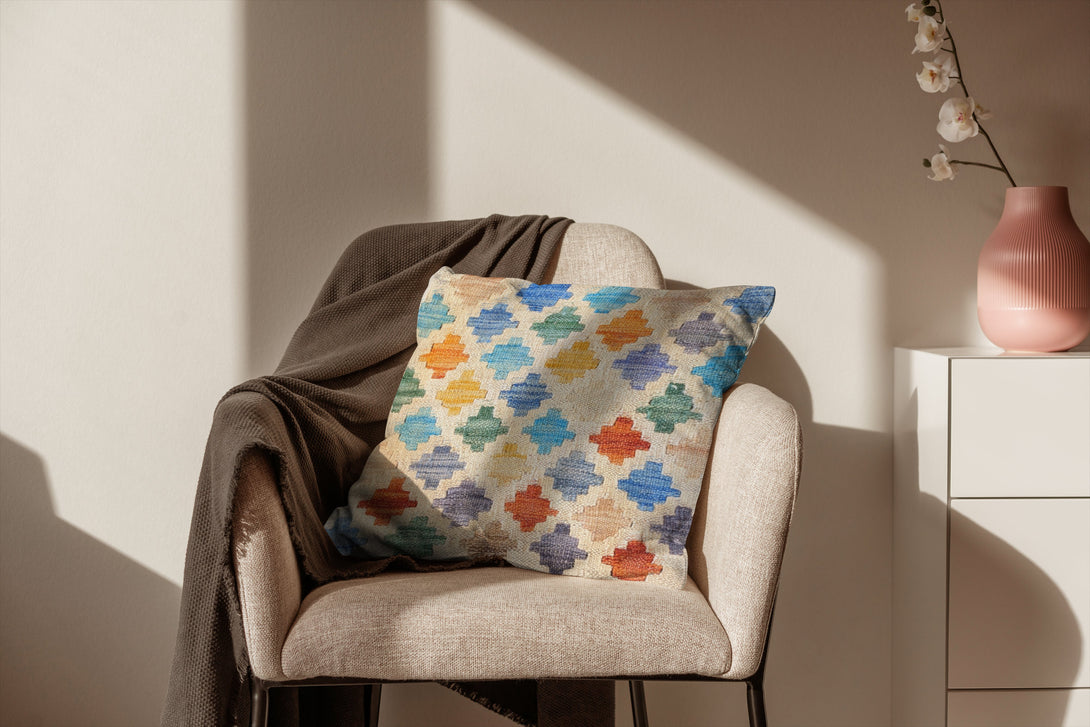 Jury is a contemporary cushion cover crafted in Pakistan with traditional Afghan wool from a kilim carpet. Kilim pieces are flat-woven on a loom, as opposed to knotted by hand. Weaved carpets have been a long-standing Afghan cultural staple, and Jury's geometric patterns mirror the timeless style. With dimensions of 46cm x 46cm, this cushion cover is well-suited for a living room, bedroom, or nursery. Its flatweave pile is soft and comfortable, and its pastel colour scheme with a coordinating geometric print adds a vibrant touch to any interior. The durable cotton backing and zip closure make it low-maintenance and reliable for years to come.