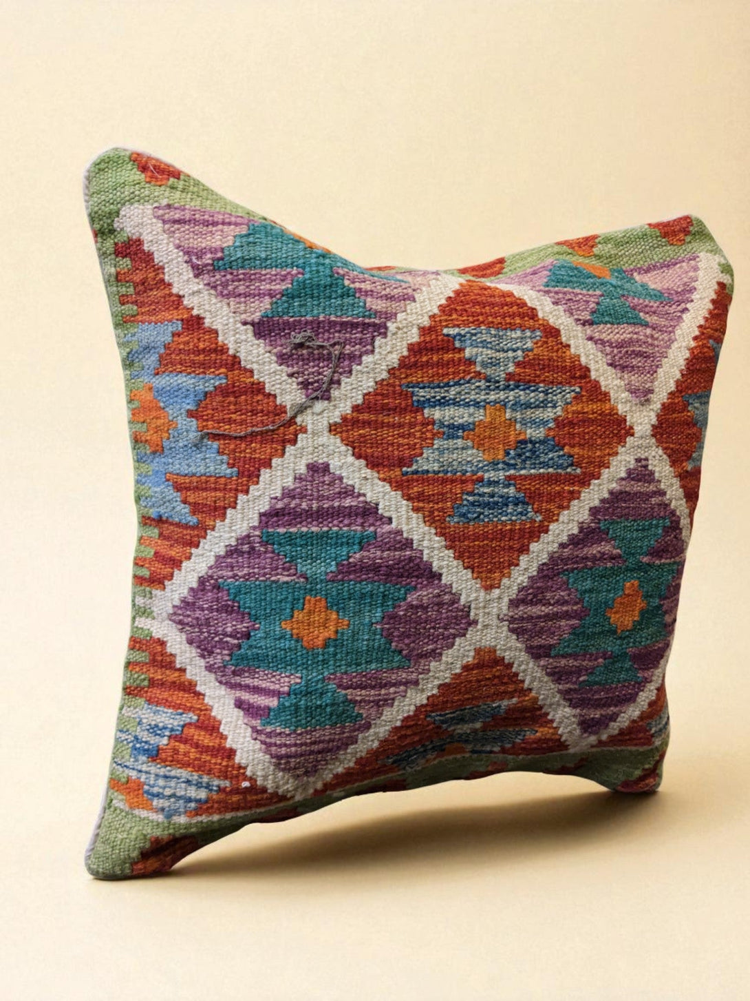 An elegant piece crafted in Pakistan with traditional Afghan wool from a kilim carpet. Kilim carpets are flat-woven rather than knotted, a style that has been part of Afghan culture for centuries. Its geometric patterns recall timeless elegance.