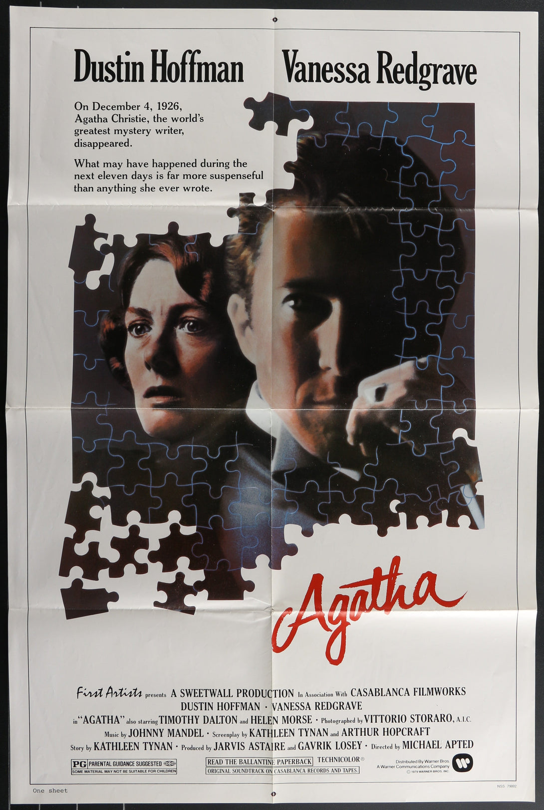This Agatha (1979) Original Folded US One-Sheet Movie Poster measures 27" x 41" (69 x 104 cm) and features stars Dustin Hoffman, Vanessa Redgrave, and Timothy Dalton. It has edge and fold wear, as well as creasing at the fold lines.