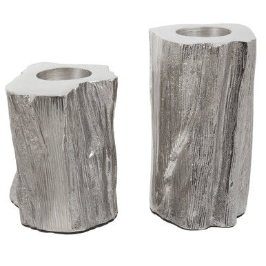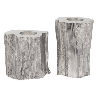 This set of two tealight holders is made from aluminium, moulded in a shape that resembles a tea trunk. The holders are finished in silver shade.
