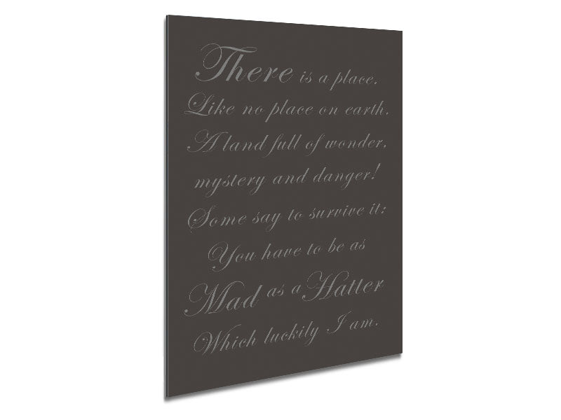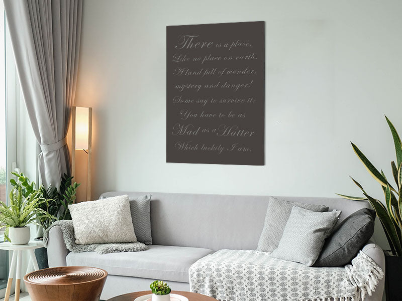 Alice In Wonderland As Mad As A Hatter Chocolate Printed on brushed aluminium dibond. A modern way to display art and easy to maintain.