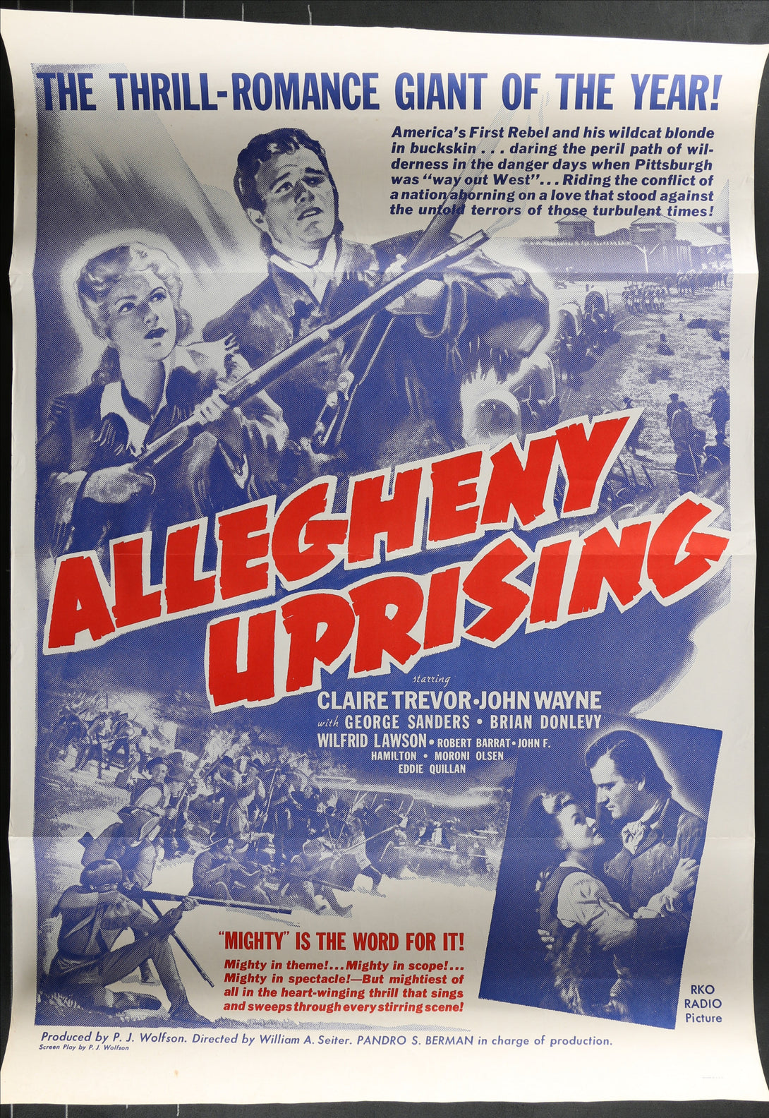 This is a 1960s re-release folded one-sheet movie poster measuring 27" x 41" (69 x 104 cm) for Allegheny Uprising, the 1939 western directed by William A. Seiter and starring Claire Trevor, John Wayne, and George Sanders. The poster exhibits edge and fold wear, along with some creases and minor markings.