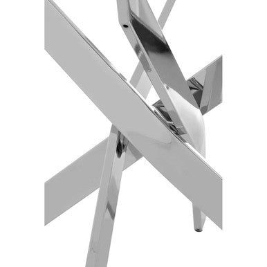 This contemporary dining table features a rectangular clear glass tabletop supported by four intersecting chrome metal legs. The sleek, angular design and transparent glass will add a touch of modern simplicity to any space.