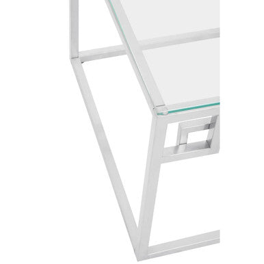 This modern coffee table is made in silver stainless steel frame with a minimal design on the sides for an aesthetic touch, tempered glass top provides surface space. With sharp edges and clean lines, this table goes perfect for modern living spaces.