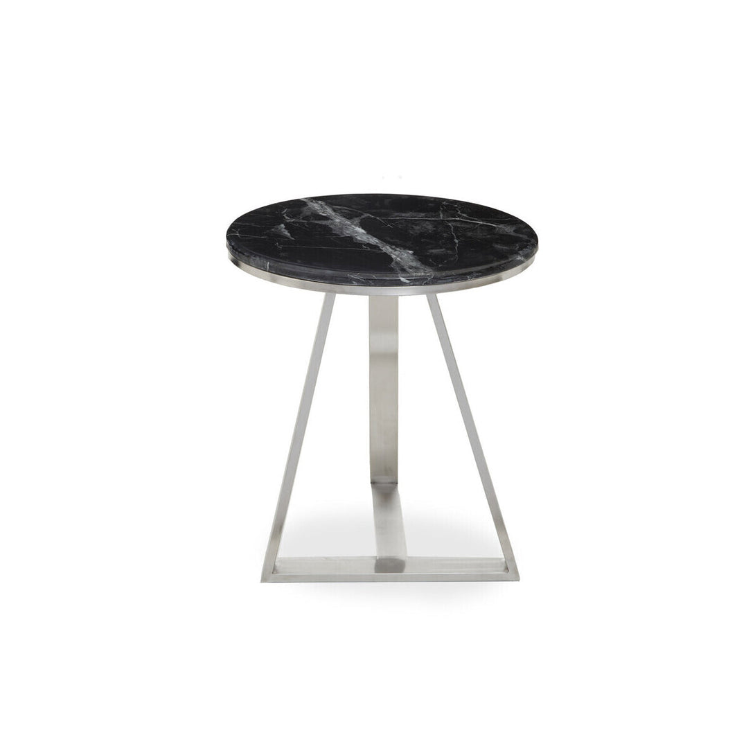 This side table has a sculptural stainless steel frame in a reflective silver finish that forms a sledge base. The sleek, angular base forms a monochrome contrast with the black marble top in sublime veining.