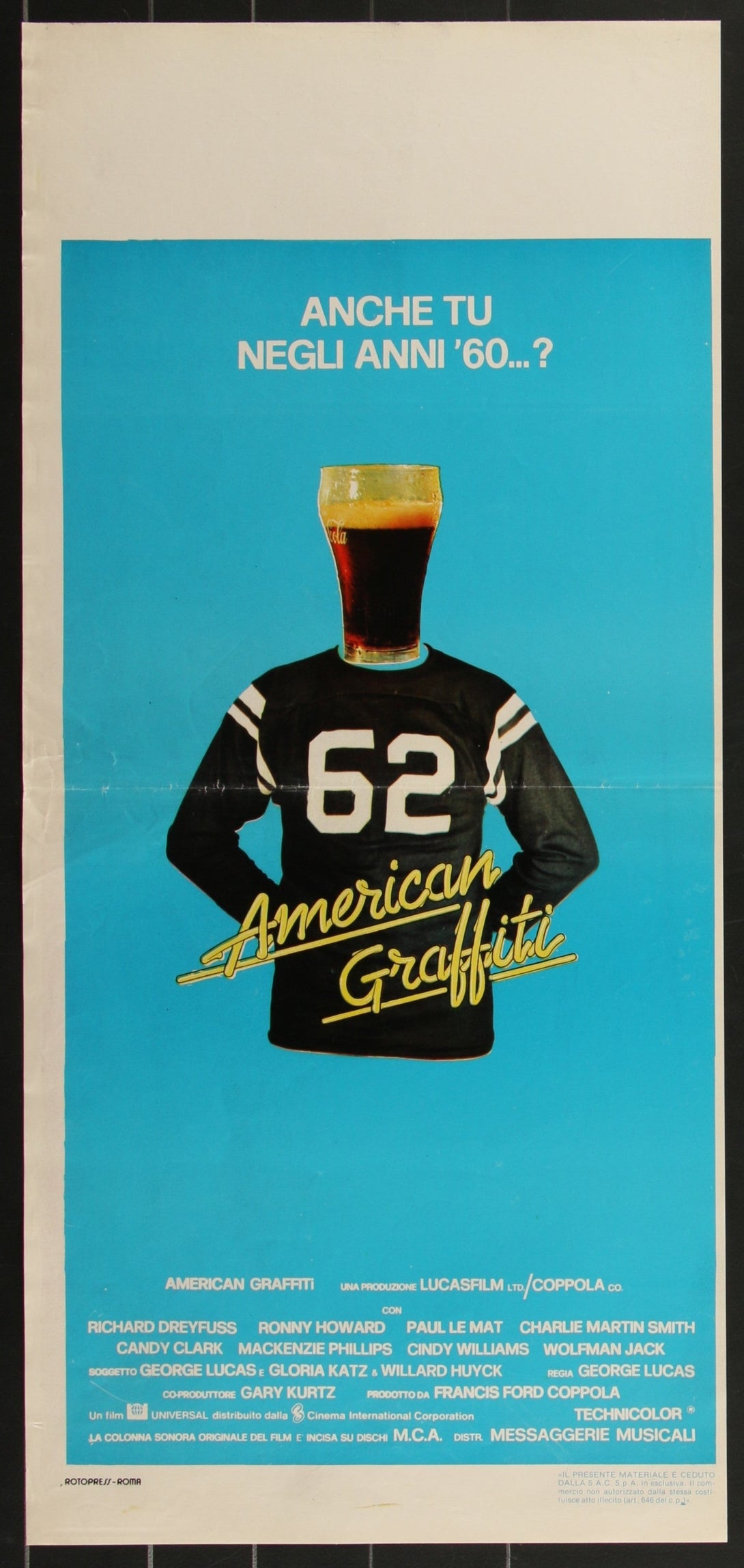 This is a Re-Release Italian Locandina Movie Poster (measures 13" x 27 3/4" [33 x 70 cm]) for American Graffiti, a timeless 1973 coming-of-age comedy directed by George Lucas, featuring acclaimed actors such as Richard Dreyfuss, Ron Howard, and Candy Clark. Some edge and fold wear.