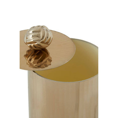Crafted from subtle, vertically textured, gold finished enamel, this small trinket box has a cylindrical design, matched by a sleek lid which is further adorned with a decorative knob handle. Ideal for storing small items, this trinket box is practical and decorative.