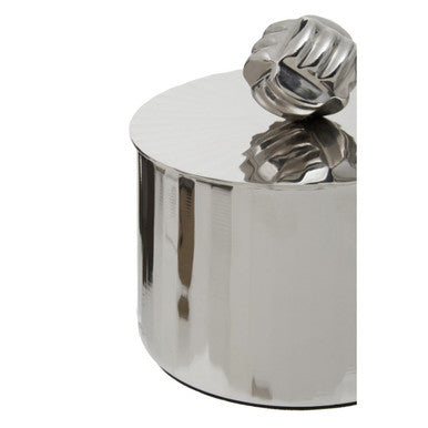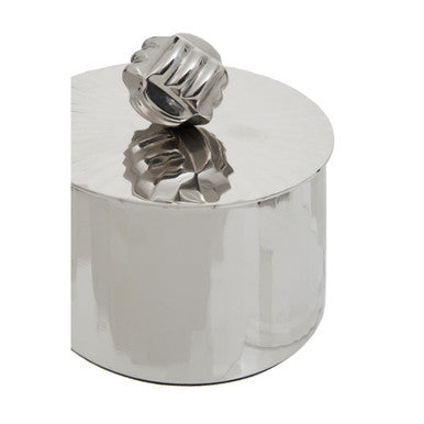 This small metal trinket box has a vertical textured surface with a shiny silver finish creating a modern look. This trinket box has a unique handle with a decorative texture that goes perfectly in contrast with a sleek body.