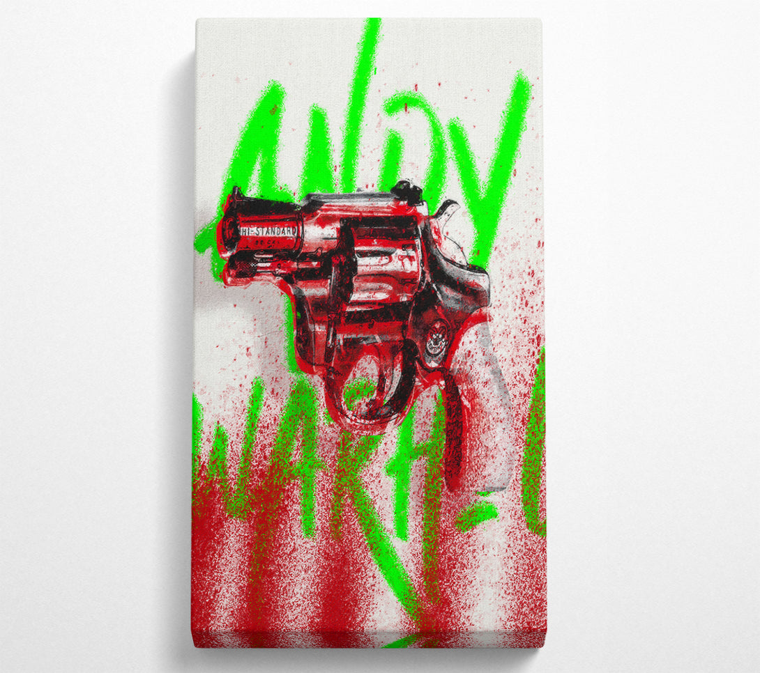 Andy Warhol Gun wide canvas, printed on coated polyester canvas. Mounted on to a 44mm box frame, ready to hang.