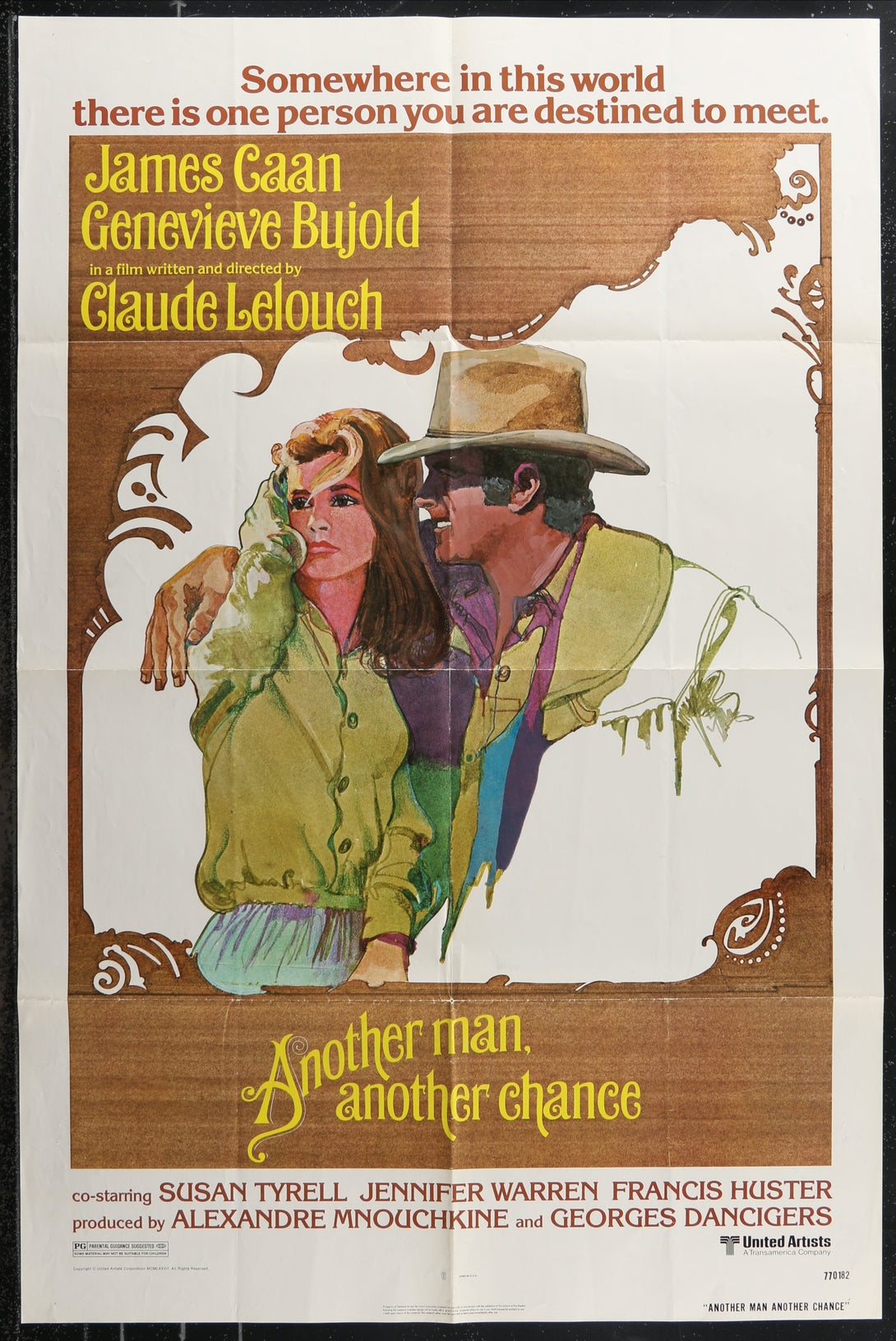 This vintage movie poster, measuring 27" x 41" (69 x 104 cm), is for the 1977 western film Another Man, Another Chance directed by Claude Lelouch and starring James Caan and Genevieve Bujold. It shows signs of edge and fold wear, as well as extra vertical creasing from being folded an extra time in the past. Pin holes are also present.