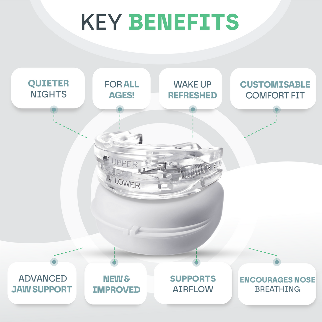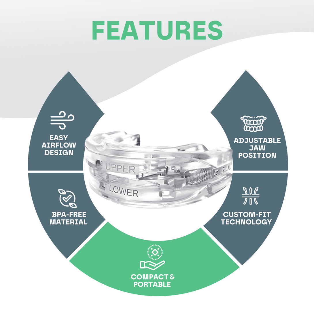 Enjoy a more restful night with our anti-snore mouth guard. Designed for comfort and stability, it gently supports your natural breathing position. With its soft-touch feel and tailored fit, it’s ideal for those looking for uninterrupted rest.