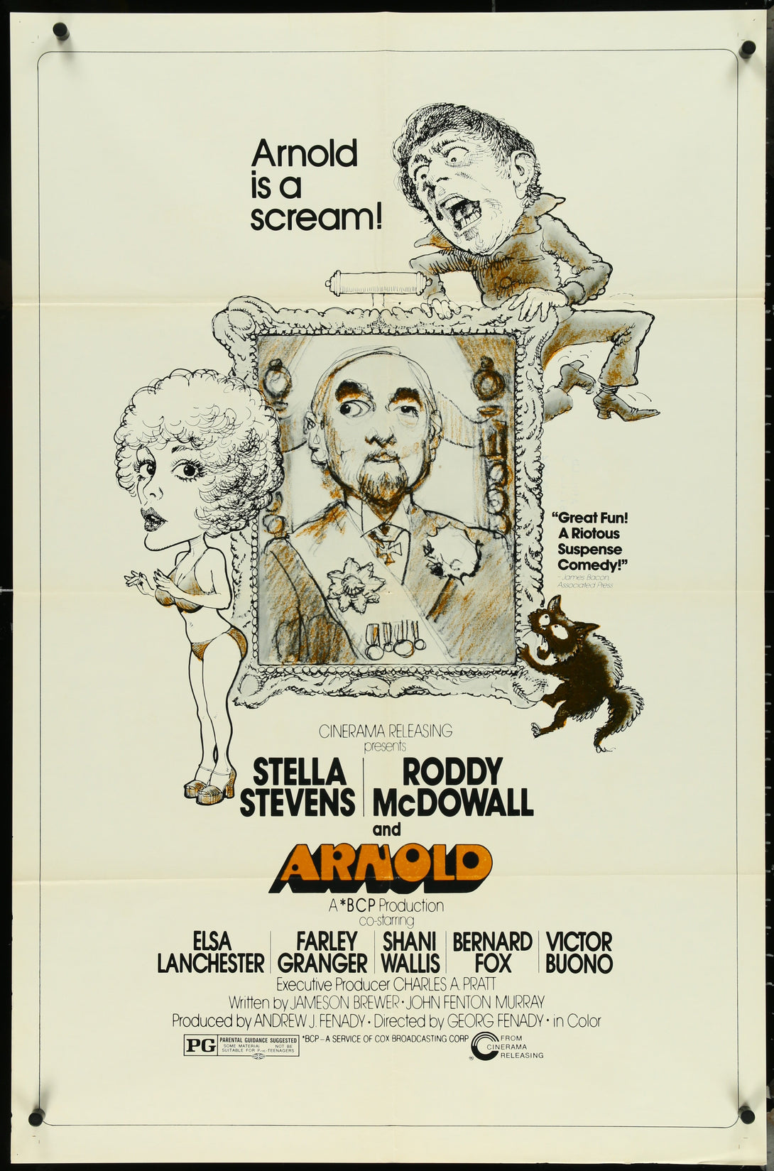 This folded poster measures 27" x 41" and features the 1973 comedy thriller Arnold, directed by Georg Fenady and starring Stella Stevens, Roddy McDowall, and Elsa Lanchester. There is some wear and small tears along the edges and folds, and areas of discoloration along the folds. Pin holes are also present.