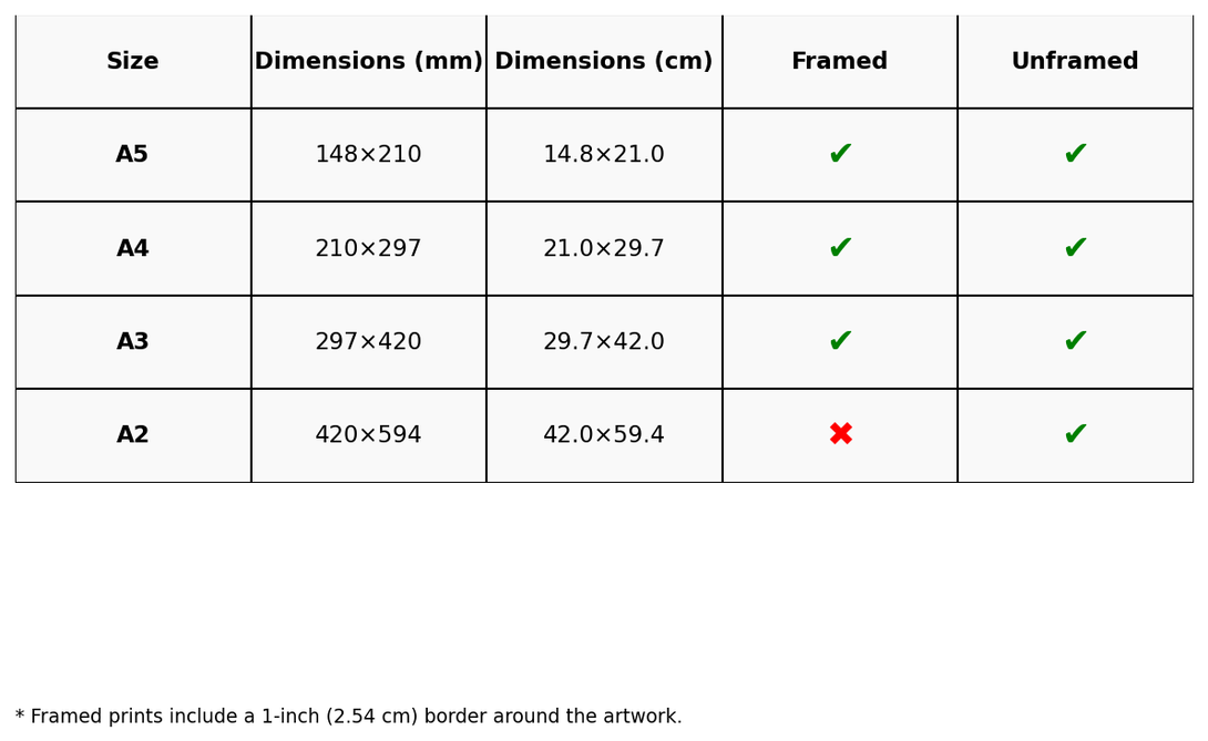 A5 (unframed) 5.8 × 8.3 in, A4 (unframed) 8.3 × 11.7 in, A3 (unframed) 11.7 × 16.5 in, A2 (unframed) 16.5 × 23.4 in, A5 Framed, A4 Framed, A3 Framed