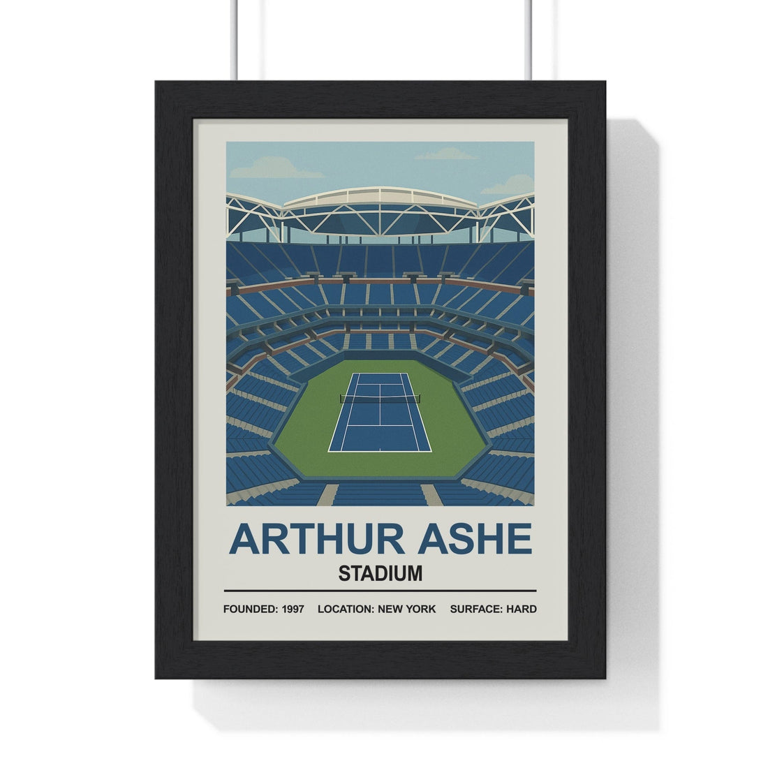 This minimalist poster honours the iconic architecture of Arthur Ashe Stadium, capturing the match‑day atmosphere beloved by US Open supporters.