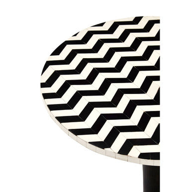 This stylish table features a geometric black and white striped tabletop, adding a touch of modern sophistication to any space. The pedestal base offers both stability and a bold visual appeal, making it a perfect accent piece for contemporary interiors.