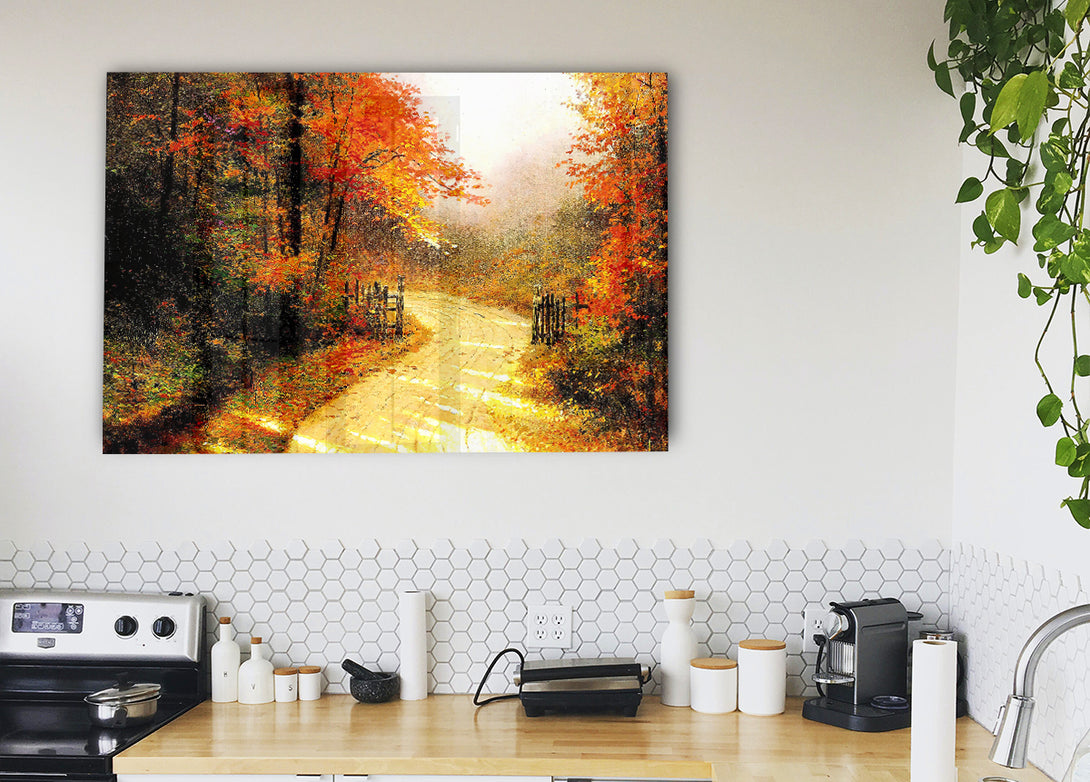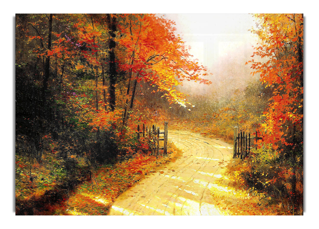 Autumn Lane By Thomas Kinkade acrylic print, UV printed onto 5mm thick acrylic glass. Comes with everything you need to hang on your wall.
