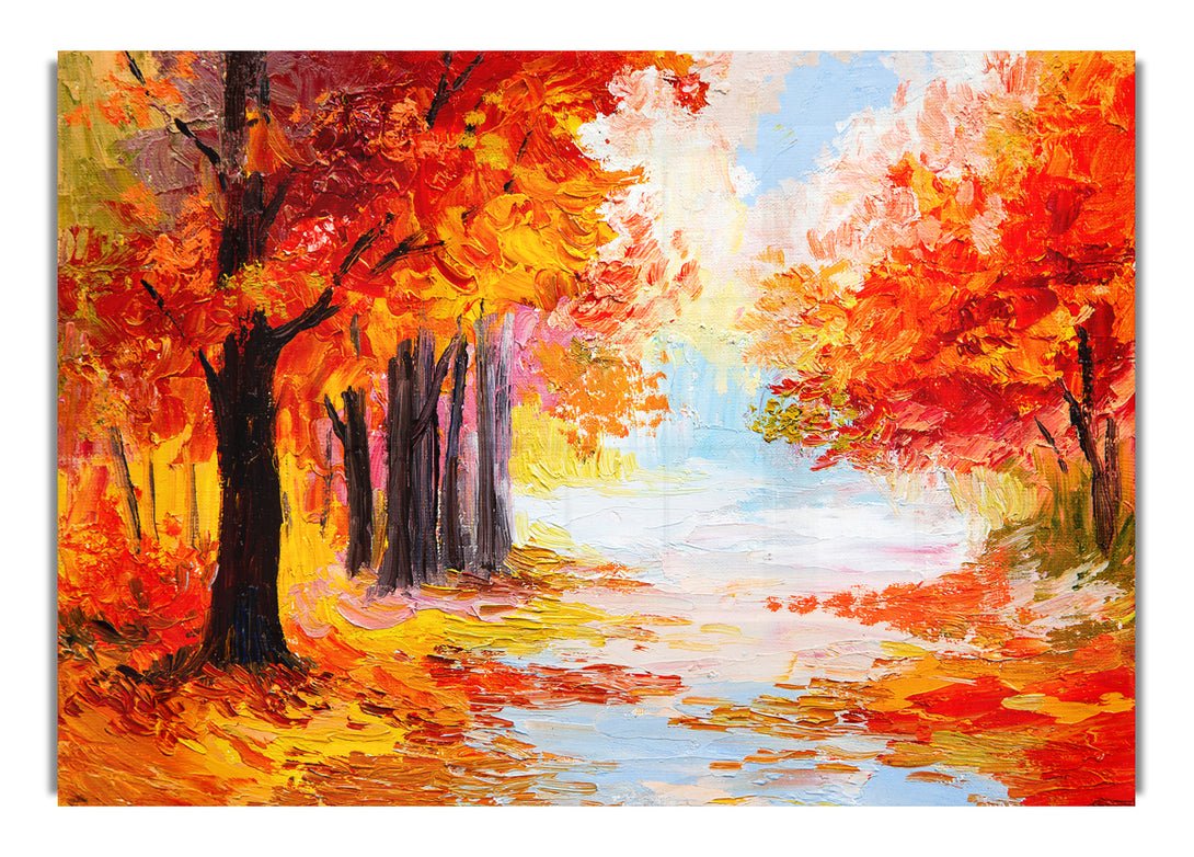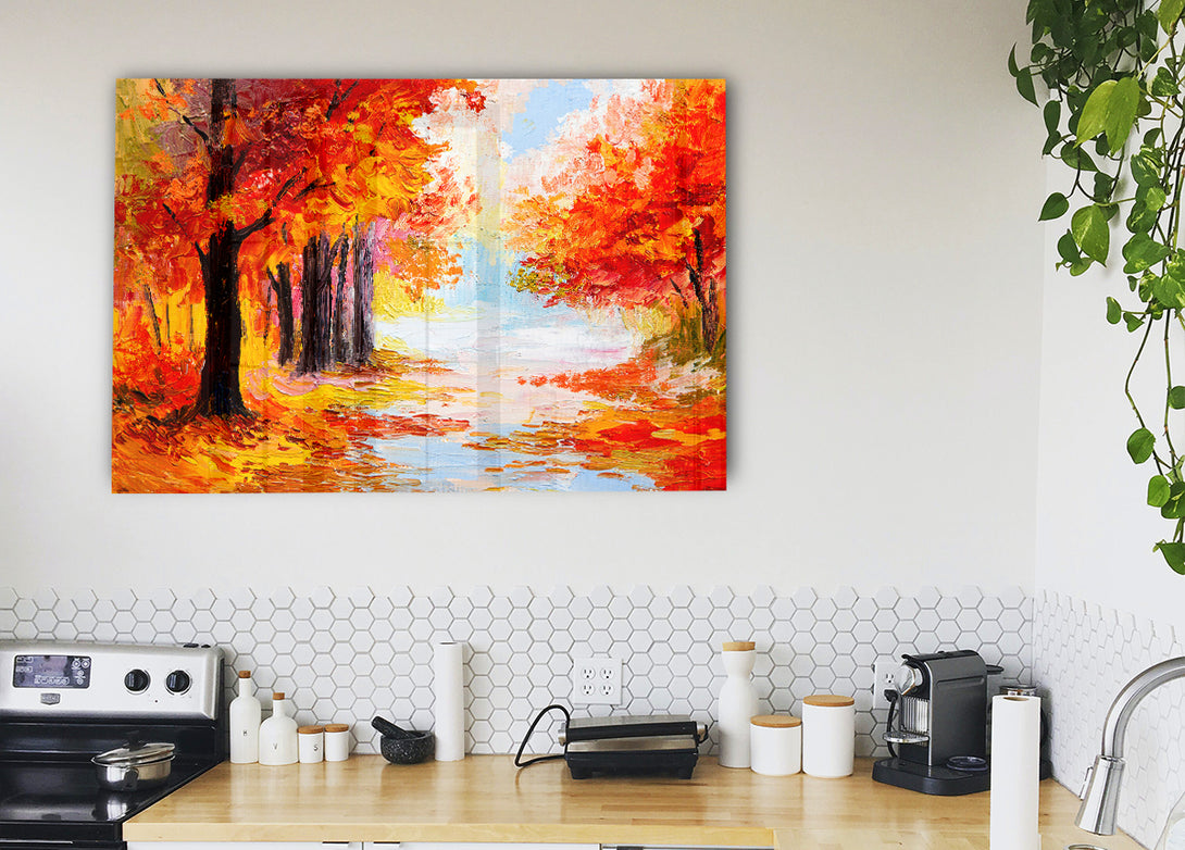 Autumn Orange Path acrylic print, UV printed onto 5mm thick acrylic glass. Comes with everything you need to hang on your wall.