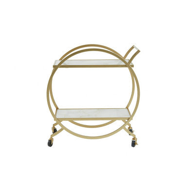 This bar cart has a luxe gold finish frame with smooth lines and curves forming a ring design. Featuring two tier design, the shelves are made from white marble in sublime veining. Easy to hold handle and castor wheels ensure swift mobility.