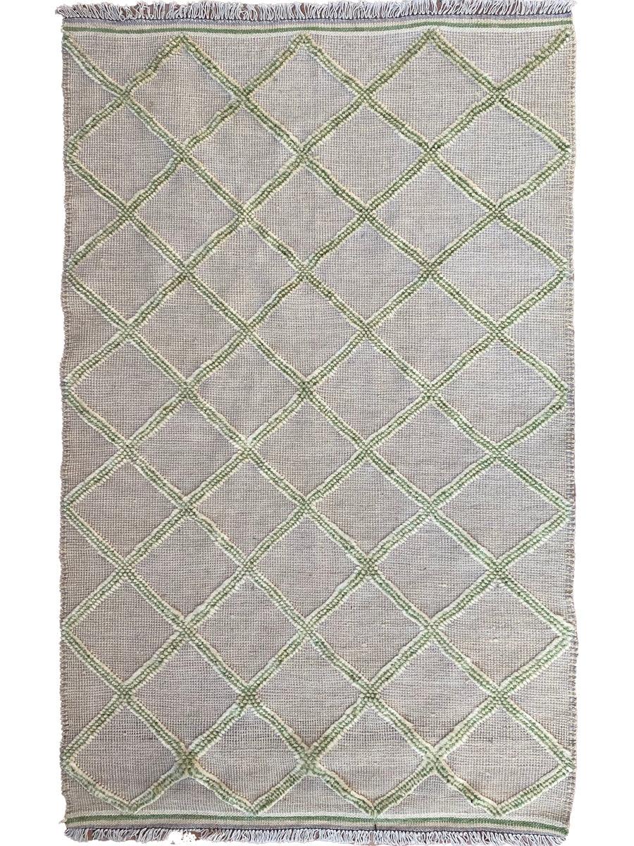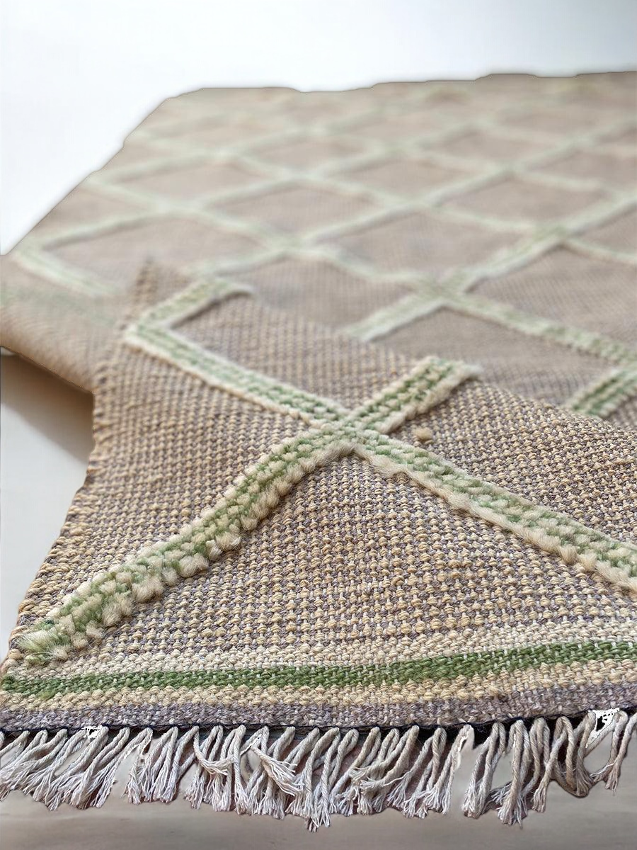 Our Nordic style rug mixes smooth, undyed natural wool with a soothing ivory base, with a distinct embossing effect in a geometric diamond pattern with interlocking lines, creating a trellis design combining ivory and mild green tone. This simple design is ideal for stimulating a calm environment because it radiates understated elegance.