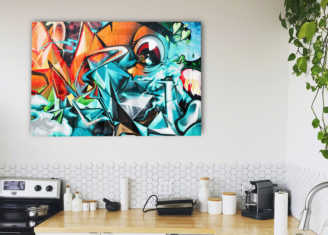 Awesome Graffiti art in space acrylic print, UV printed onto 5mm thick acrylic glass. Comes with everything you need to hang on your wall.