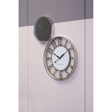 Its case is made from smooth metal and has a slim design that contributes to the clock's subtle aesthetic. The metal has a reflective chrome finish that allows the clock to be styled with metallic lighting and textiles. It features a mirrored face, adding to its reflective appeal. The minute and hour hands are coloured black and are slim to complement the overall design.