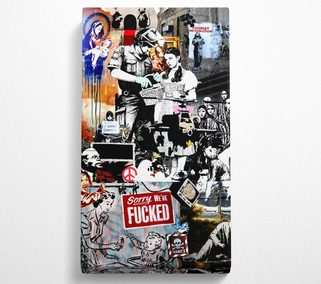 Banksy Collage 2 canvas, printed on coated polyester canvas. Mounted on to a 44mm box frame, ready to hang.