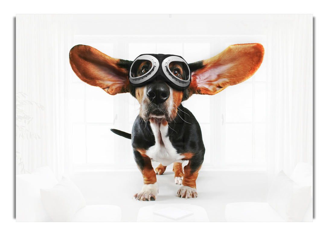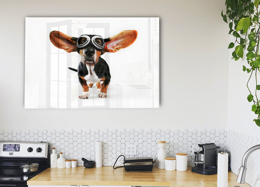 Basset Hound Flight acrylic print, UV printed onto 5mm thick acrylic glass. Comes with everything you need to hang on your wall.