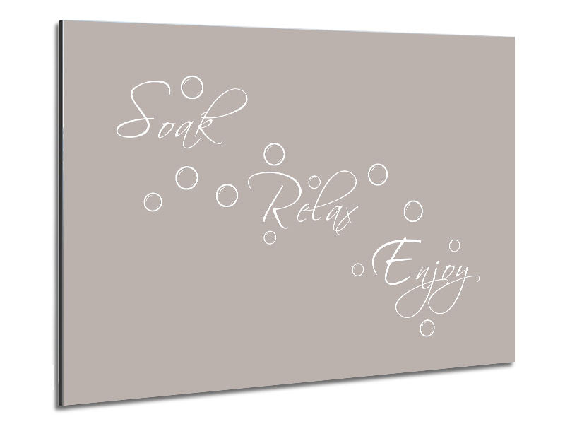 Bathroom Quote Soak Relax Enjoy Beige Printed on brushed aluminium dibond. A modern way to display art and easy to maintain.