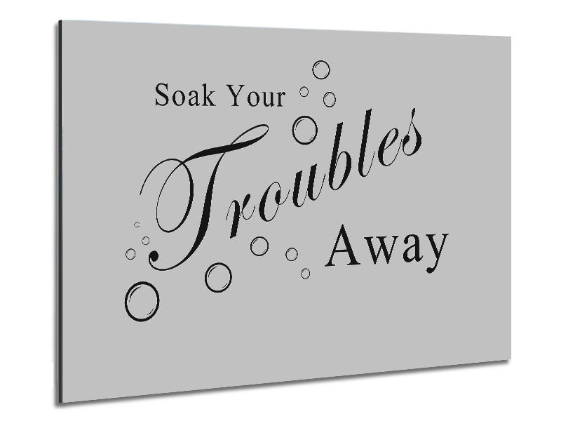 Bathroom Quote Soak Your Troubles Away Grey Printed on brushed aluminium dibond. A modern way to display art and easy to maintain.