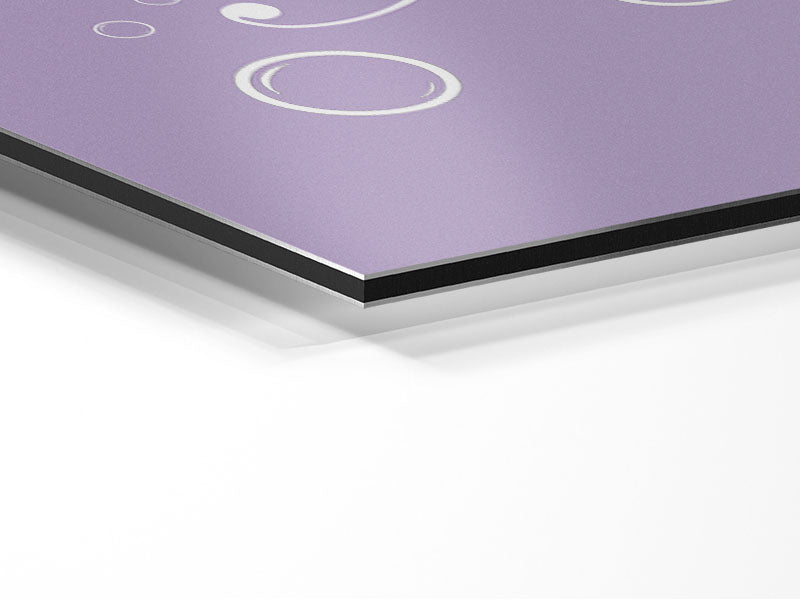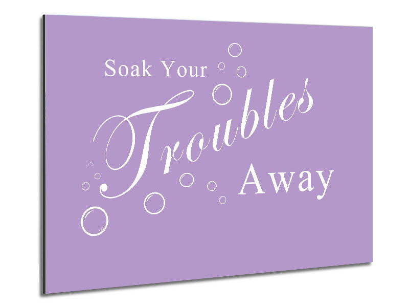 Bathroom Quote Soak Your Troubles Away Lilac Printed on brushed aluminium dibond. A modern way to display art and easy to maintain.